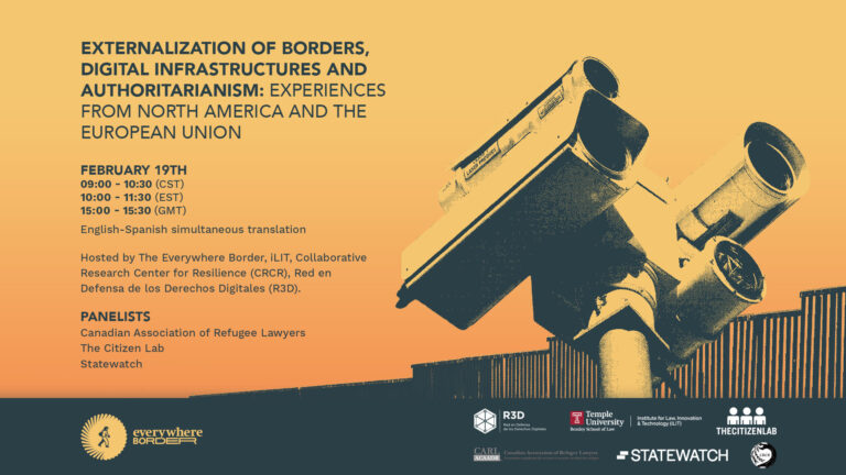Tune in on February 19th to listen to senior research associate Kate Robertson speak on the Everywhere Border’s “Externalization of Borders, Digital Infrastructures and Authoritarianism” webinar. The discussion will consider recent developments in the EU and North America involving a pattern of migrant rights violations, increased surveillance, and militarization.