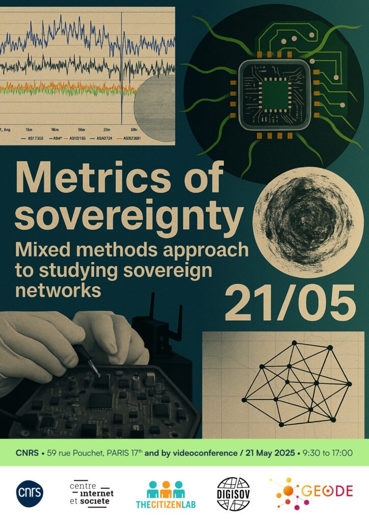 This workshop is co-organized by DIGISOV, CIS CNRS, and GEODE and will take place on May 21, 2025, from 9:30 to 17:00, in Paris 17th (CNRS Pouchet) and by videoconference. The first part of the workshop features case study presentations, including talks by the Citizen Lab’s Ksenia Ermoshina, Jeffrey Knockel, Bill Marczak, and Irene Poetranto, followed by a moderated discussion. The second part includes hands-on sessions introducing software tools for measuring and visualizing internet connectivity, traffic filtering, and network fragmentation.