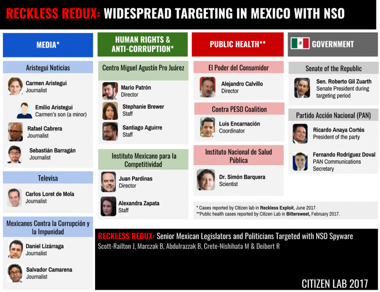 On June 19, 2017 Citizen Lab’s Reckless Exploit report received front page coverage on the New York Times. This research revealed that Mexican journalists and lawyers were the targets of sophisticated phishing attempts, using government-exclusive spyware produced by the NSO Group. This work was done in partnership with R3D, SocialTic, and Article 19.