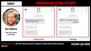 New York Times journalist Ben Hubbard was targeted with NSO Group’s Pegasus spyware via a June 2018 SMS message promising details about “Ben Hubbard and the story of the Saudi Royal Family.” The SMS contained a hyperlink to a website used by a Pegasus operator that we call KINGDOM. We have linked KINGDOM to Saudi Arabia. In 2018, KINGDOM also targeted Saudi dissidents including Omar Abdulaziz, Ghanem al-Masarir, and Yahya Assiri, as well as a staff member at Amnesty International.