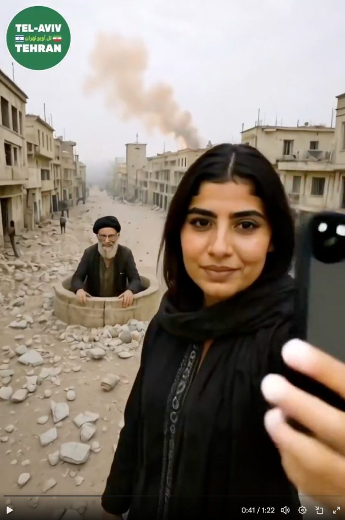 | https://x[.]com/TelAviv_Tehran/status/1937542242341671126 | https://x[.]com/NPiruzi/status/1937538928329801898 | AI-generated re-enactment of a famous – and often turned into a meme – scene from the movie “Der Untergang” (“Downfall”, 2004), with Ali Khamenei and apparent IRGC members replacing the characters of Adolf Hitler and Nazi top officials. |