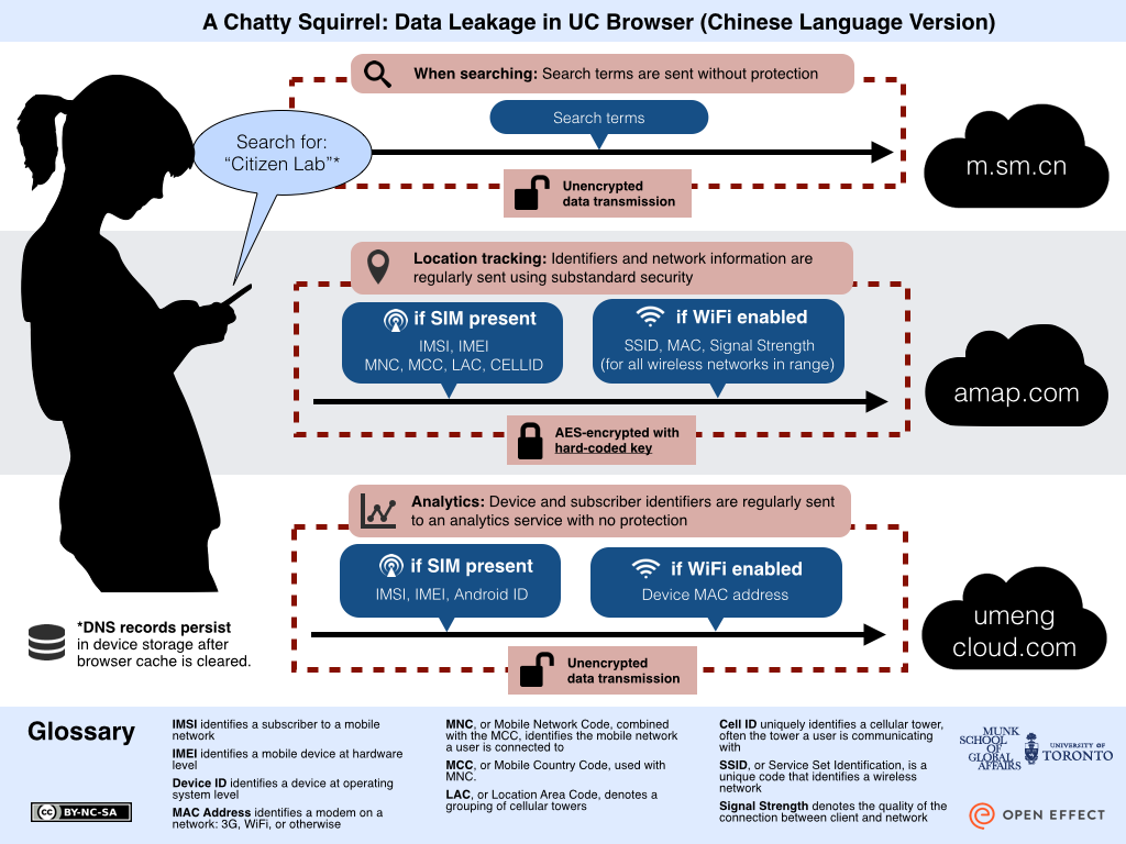 UC Browser is the most popular mobile web browser in China and India, boasting over 500 million users. This report provides a detailed analysis of how UC Browser manages and transmits user data, particularly private data, during its operation. Our research was prompted by revelations in a document leaked by Edward Snowden on which the Canadian Broadcasting Corporation (CBC) was preparing a story. The CBC contacted us requesting our comment. The document, apparently prepared in 2012 by Canada’s signals intelligence agency, the Communications Security Establishment (CSE), noted the existence of security vulnerabilities in UC Browser. Given the Citizen Lab’s ongoing research into popular Asian communications tools, and the possibility of vulnerabilities affecting a large number of users, we decided to conduct an independent investigation of UC Browser. While media outlets are publishing a story about the CSE document, we cannot determine if the problems we identify in UC Browser and that are described in this report are identical to those referenced in the 2012 CSE document.
