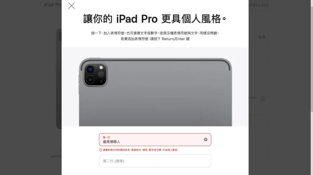 | iPad | https://www.apple.com/tw/shop/validate-engraving?product=MHQR3TA%2FA&msg.0=[ENGRAVING]&msg.1=&f=mixed | |