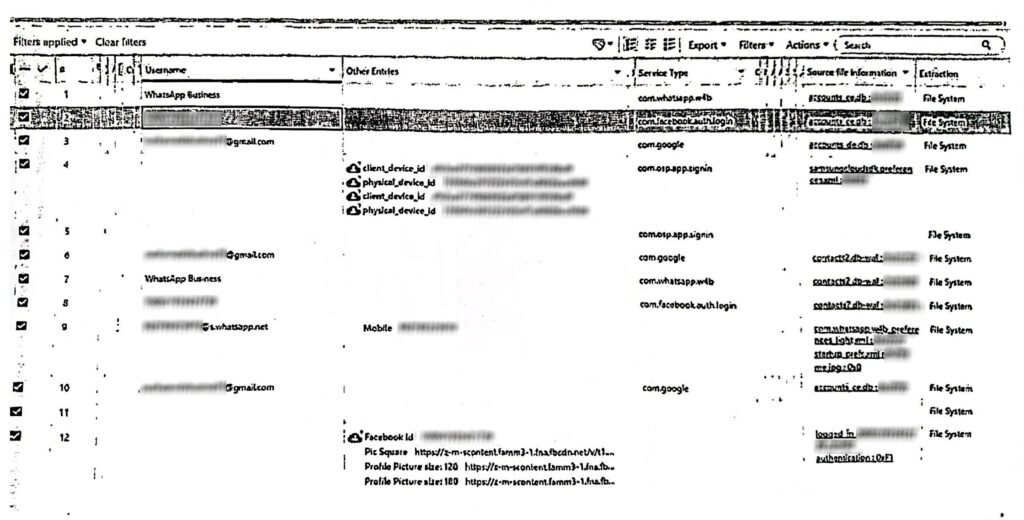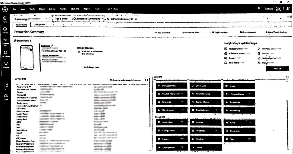 This finding is further corroborated by screenshots provided in court records showing the summary dashboard generated by the Cellebrite extraction (Figure 4). The dashboard displays the number of images, videos, passwords, and emails extracted, as well as the IDs of other social media accounts. While the numbers next to each data point (e.g., Email – 3, User Accounts – 11, Documents – 1492) were blurred for privacy, the categories and overall structure remain visible.