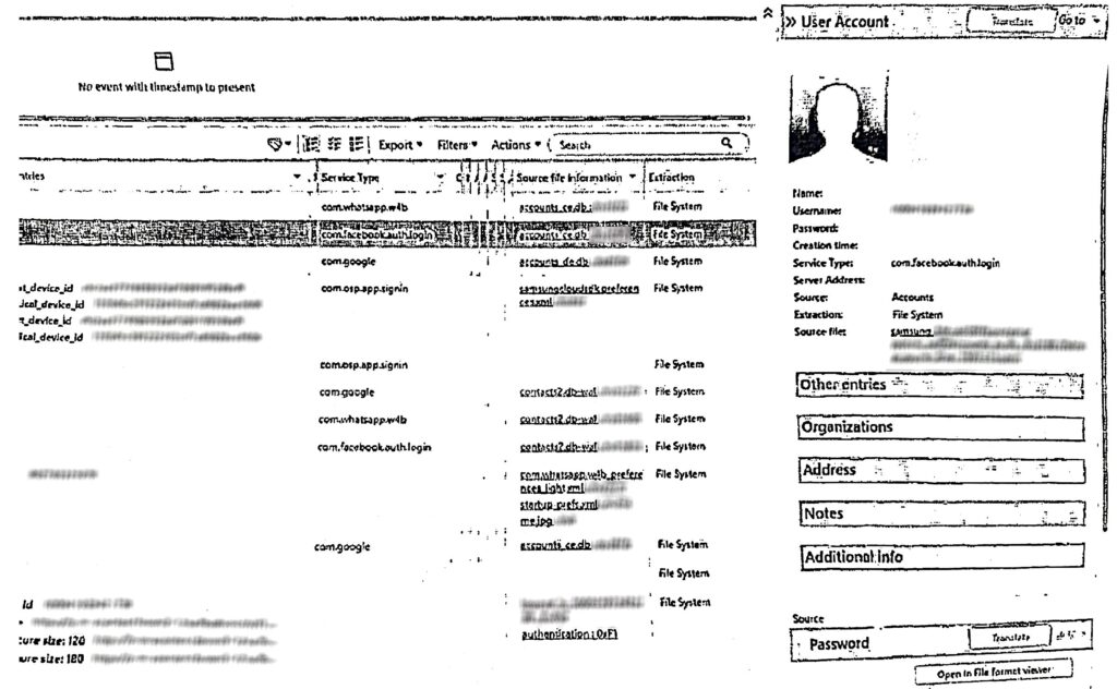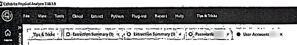 Zooming in on the court records shared with the Citizen Lab and specifically screenshots displaying results from the Cellebrite extraction (Figure 7), we observe a few open tabs in the Cellebrite Physical Analyzer dashboard, including one labeled “Passwords.” This suggests that the unit examining the device may have viewed or intended to view data outside the scope of the case, underscoring the intrusiveness of the search.