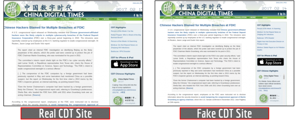 The link connects to a web page that mirrors content from the real CDT website displaying an article related to hacker groups from China (see Figure 1 for comparison of the real and fake content).