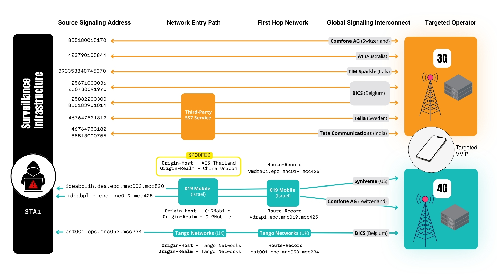 This hidden signalling layer also allows attackers to masquerade as trusted operators by using legitimate signalling identifiers and interconnect providers. When operators provide third-party access to their infrastructure through commercial leasing arrangements, surveillance operations assume the identity of the operator, masking attacker attribution.
