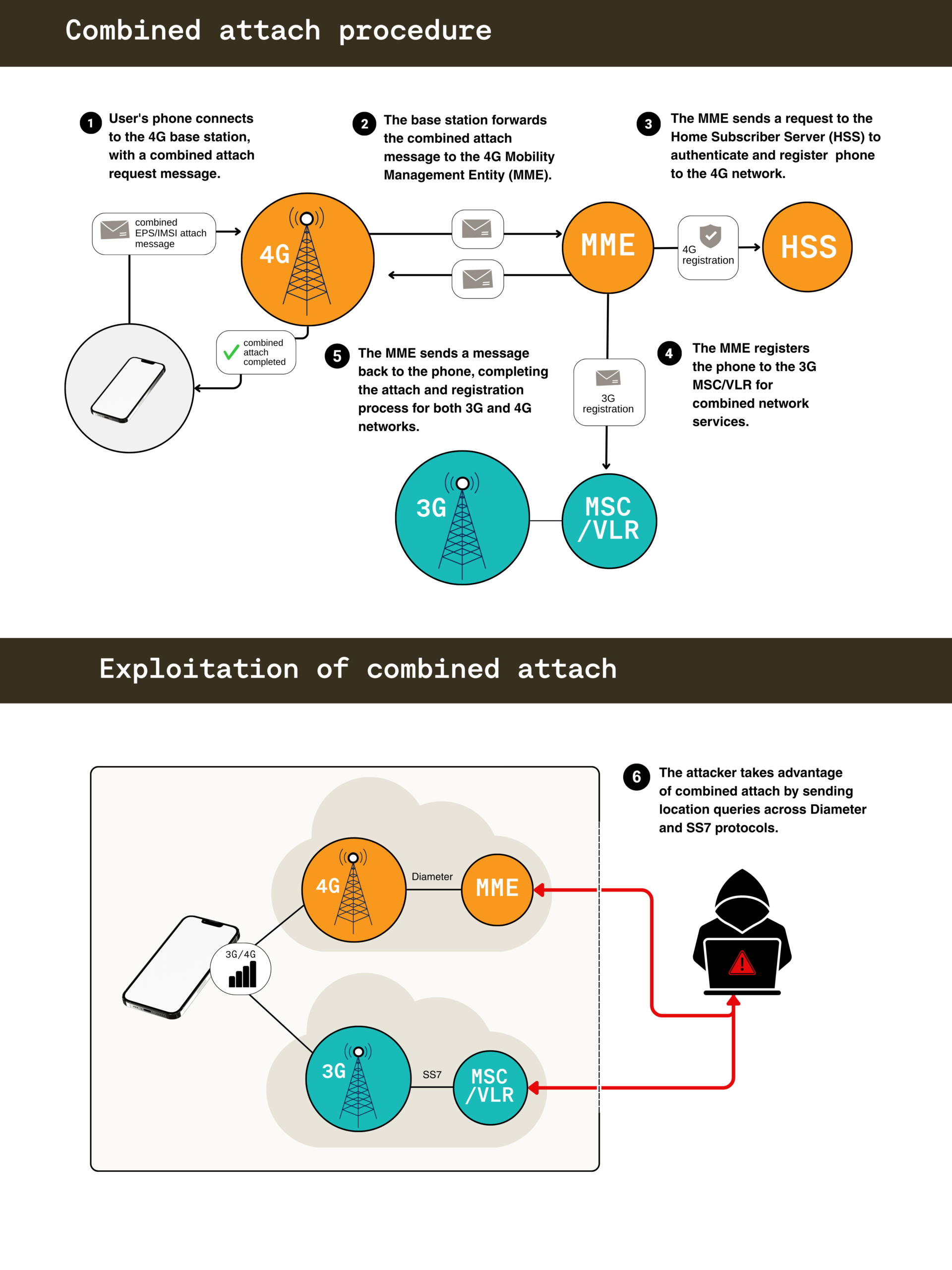 Additional security risks arise from the interoperability between modern 4G/5G networks and older 3G systems. Operators that have deployed both networks support a procedure known as combined attach,2 which allows a roaming device to register with both 3G and 4G networks simultaneously for service continuity and fallback.