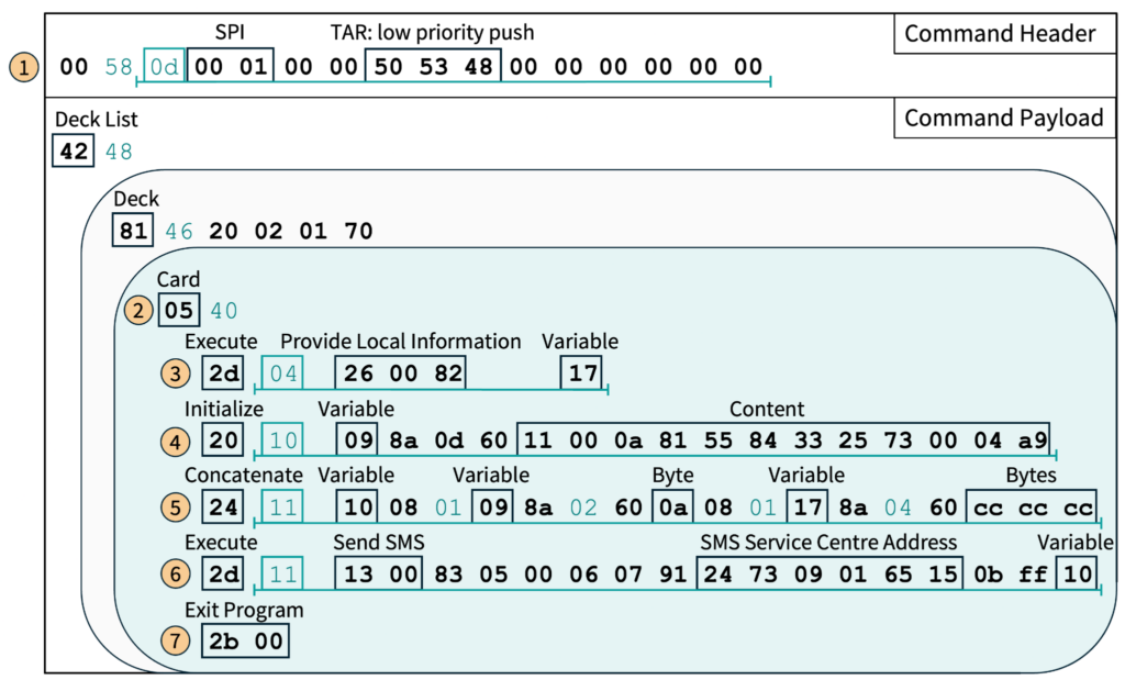 A command packet for the S@T browser is organized into structures known as “decks,” each containing “cards” that group related commands. Because a packet can include multiple decks, the payload begins with a deck list that defines its structure. The attack SMS contains one dynamic deck with one card (step (2) in Figure 10). The S@T browser never saves dynamic decks, so no traces of the attack are left on the SIM. This makes post-incident detection challenging, as it is difficult to determine if an attack was conducted on the device. Only timestamped network traces of the malicious action can provide clues. The card inside the attack SMS encloses five commands. Each bytecode command is identified by a tag. Besides the bytecode commands, the S@T browser is capable of executing STK commands, which are sent as proactive commands from the SIM card to the phone. The phone’s response is stored in a variable of the S@T browser. The following commands would have been executed sequentially by the S@T browser if the firewall did not block the SMS: