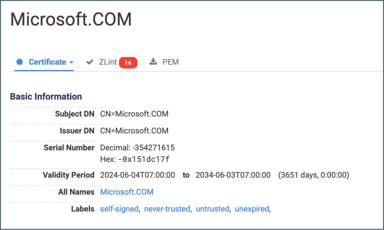 According to Censys, a self-signed, untrusted TLSv1 certificate for “Microsoft.COM” was observed on both of these IP addresses. The certificate had the following hash: