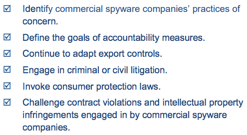 We are releasing a more comprehensive “checklist” consolidating our thoughts on how best to confront the lack of accountability in the commercial spyware trade.